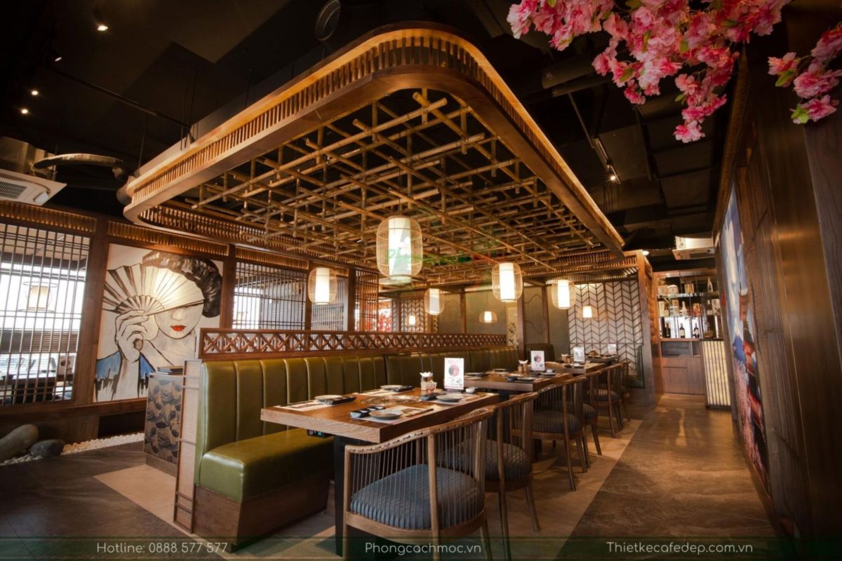 Một trong những điểm nhấn nổi bật của phong cách này chính là các hình ảnh mang đậm bản sắc văn hóa Nhật Bản, như hình ảnh samurai, thiếu nữ trong trang phục kimono, hoa anh đào, núi Phú Sĩ và sóng biển. Không gian nhà hàng được thiết kế theo hướng tối giản nhưng vẫn giữ được sự tinh tế và sang trọng, đảm bảo tính thẩm mỹ cao, từ đó thu hút và tạo ấn tượng mạnh mẽ cho khách hàng khi đến thưởng thức.